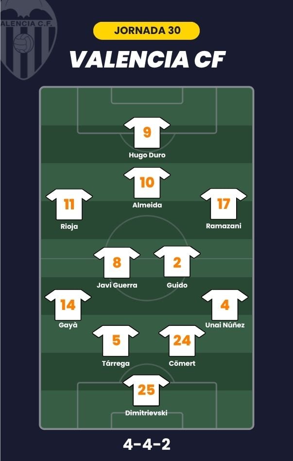 - Valencia CF: Dimitrievski; Unai Núñez, Tárrega, Cömert, Gayà; Guido Rodríguez, Javi Guerra, Almeida; Ramazani, Rioja y Huego Duro