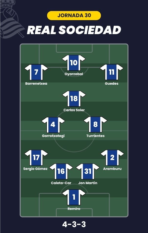 - Real Sociedad: Remiro; Aramburu, Caleta-Car, Jon Martín, Sergio Gómez; Gorrotxategi, Turrientes, Carlos Soler; Guedes, Barrenetxea y Oyarzabal