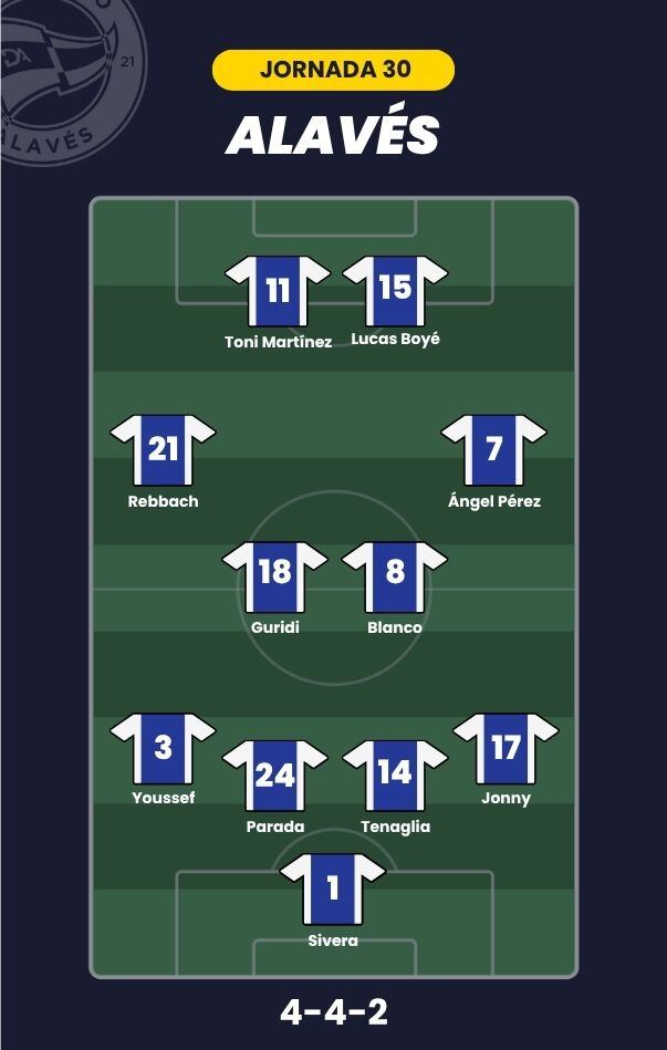 - Deportivo Alavés: Sivera; Jonny Castro, Tenaglia, Parada, Youssef; Blanco, Guridi, Ángel Pérez, Rebbach; Toni Martínez y Lucas Boyé