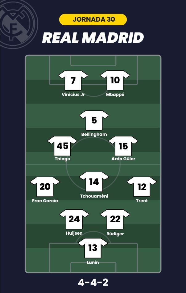 - Real Madrid: Lunin; Trent, Rüdiger, Huijsen, Carreras; Tchouaméni, Thiago Pitarch, Arda Güler, Bellingham; Vinicius y Mbappé