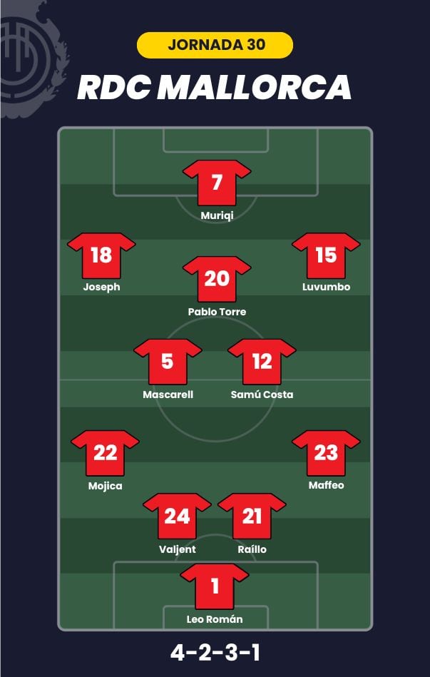 - RCD Mallorca: Leo Román; Maffeo, Valjent, Raíllo, Mojica; Mascarell, Samú Costa, Pablo Torre; Luvumbo, Joseph y Muriqi