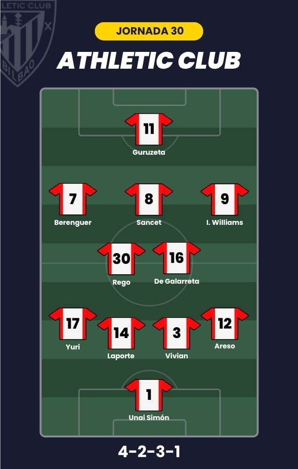- Athletic Club: Unai Simón; Areso, Vivian, Laporte, Yuri Berchiche; De Galarreta, Rego, Sancet, Iñaki Williams, Berenguer; y Guruzeta