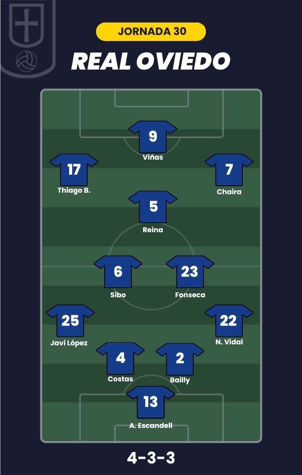 - Real Oviedo: Aarón; Nacho Vidal, Bailly, Costas, Javi López; Fonseca, Sibo, Reina; Chaira, Thiago y Viñas