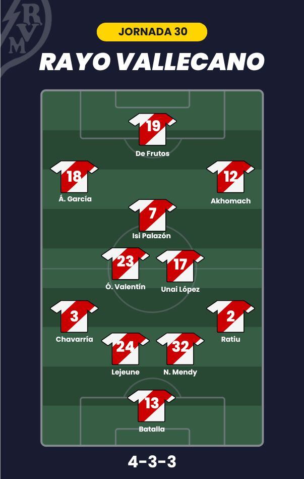 - Rayo Vallecano: Batalla; Ratiu, Lejeune, Mendy, Pep Chavarría; Óscar Valentín, Unai López; Isi Palazón, Ilias Akhomach, Álvaro García; y De Frutos