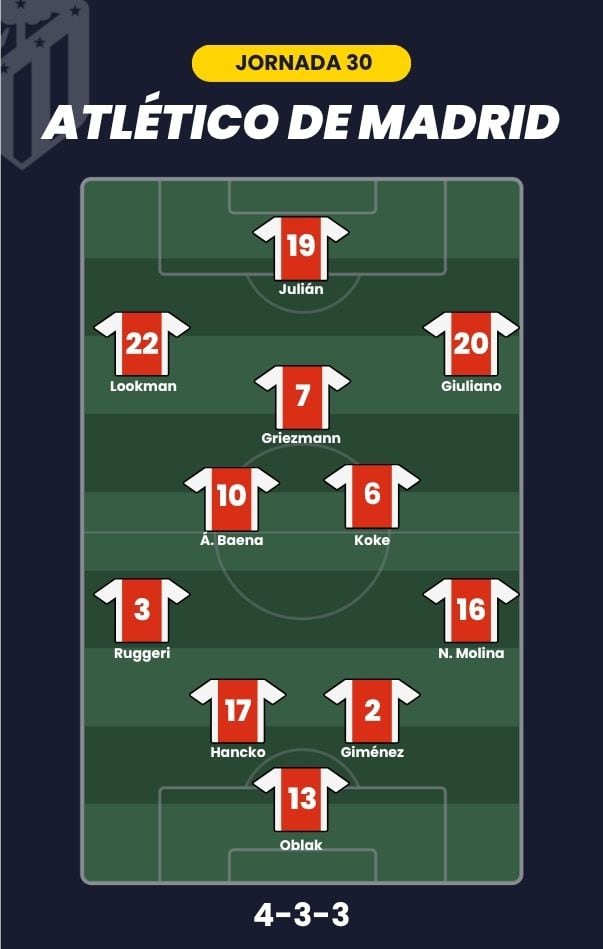 - Atlético de Madrid: Oblak; Nahuel Molina, Pubill, Hancko, Ruggeri; Koke, Álex Baena, Griezmann; Giuliano, Lookman y Julián Álvarez