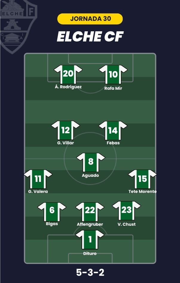 - Elche CF: Dituro; Tete Morente, Víctor Chust, Affengruber, Bigas, Germán Valera; Aguado, Febas, Gonzalo Villar; Álvaro Rodríguez y Rafa Mir