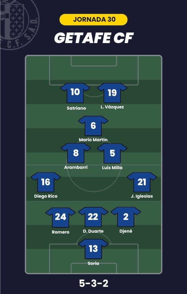 - Getafe CF: Soria; Juan Iglesias, Djené, Domingos Duarte, Romero, Diego Rico; Arambarri, Luis Milla, Mario Martín; Luis Vázquez y Satriano