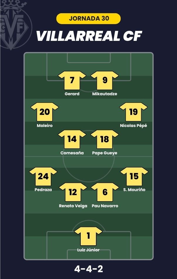 - Villarreal CF: Luiz Junior; Mouriño, Pau Navarro, Renato Veiga, Pedraza; Pape Gueye, Comesaña, Nicolas Pépé, Moleiro; Gerard Moreno y Mikautadze