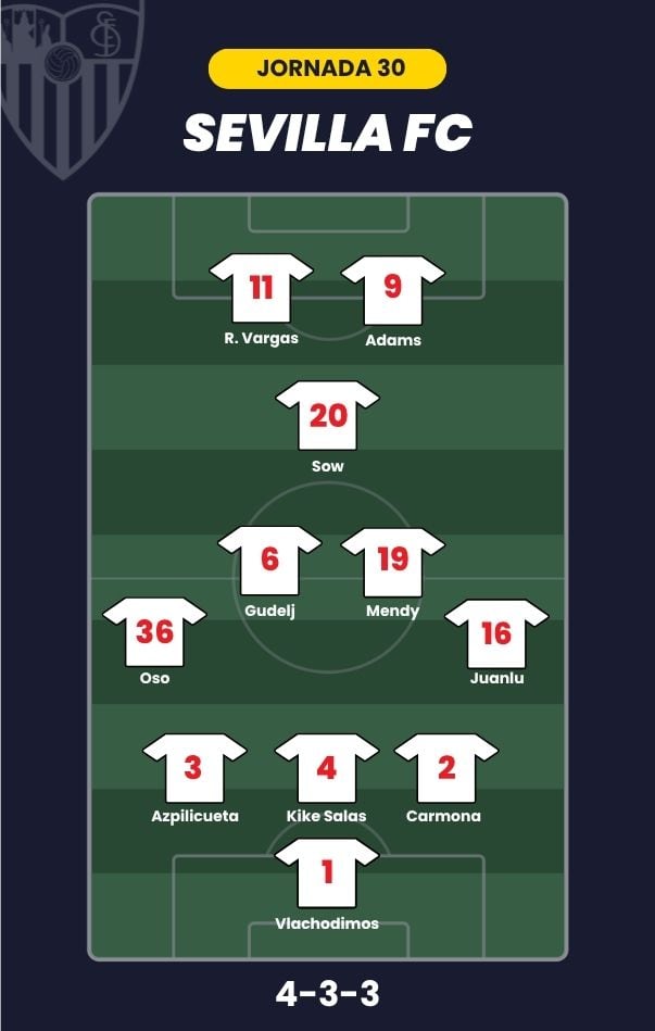 - Sevilla FC: Vlachodimos; Carmona, Azpilicueta, Kike Salas, Oso; Gudelj, Mendy, Sow; Juanlu, Rubén Vargas y Adams