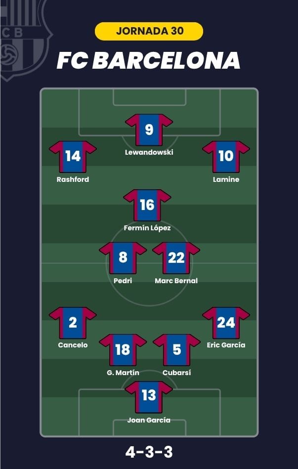 - FC Barcelona: Joan García; Eric García, Cubarsí, Gerard Martín, Cancelo; Marc Bernal, Pedri, Fermín López; Lamine Yamal, Rashford y Lewandowski