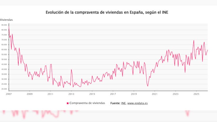 En el mes de febrero se oficializaron un total de 59.689 compraventas de viviendas, un 0,5% menos que en el mismo mes de 2025, lo que supone que las compraventas caen por segundo mes consecutivo, tras el descenso del 5% registrado en enero, según la Estadística de Transmisiones de Derechos de la Propiedad (EDTP) publicada este jueves por el Instituto Nacional de Estadística (INE).