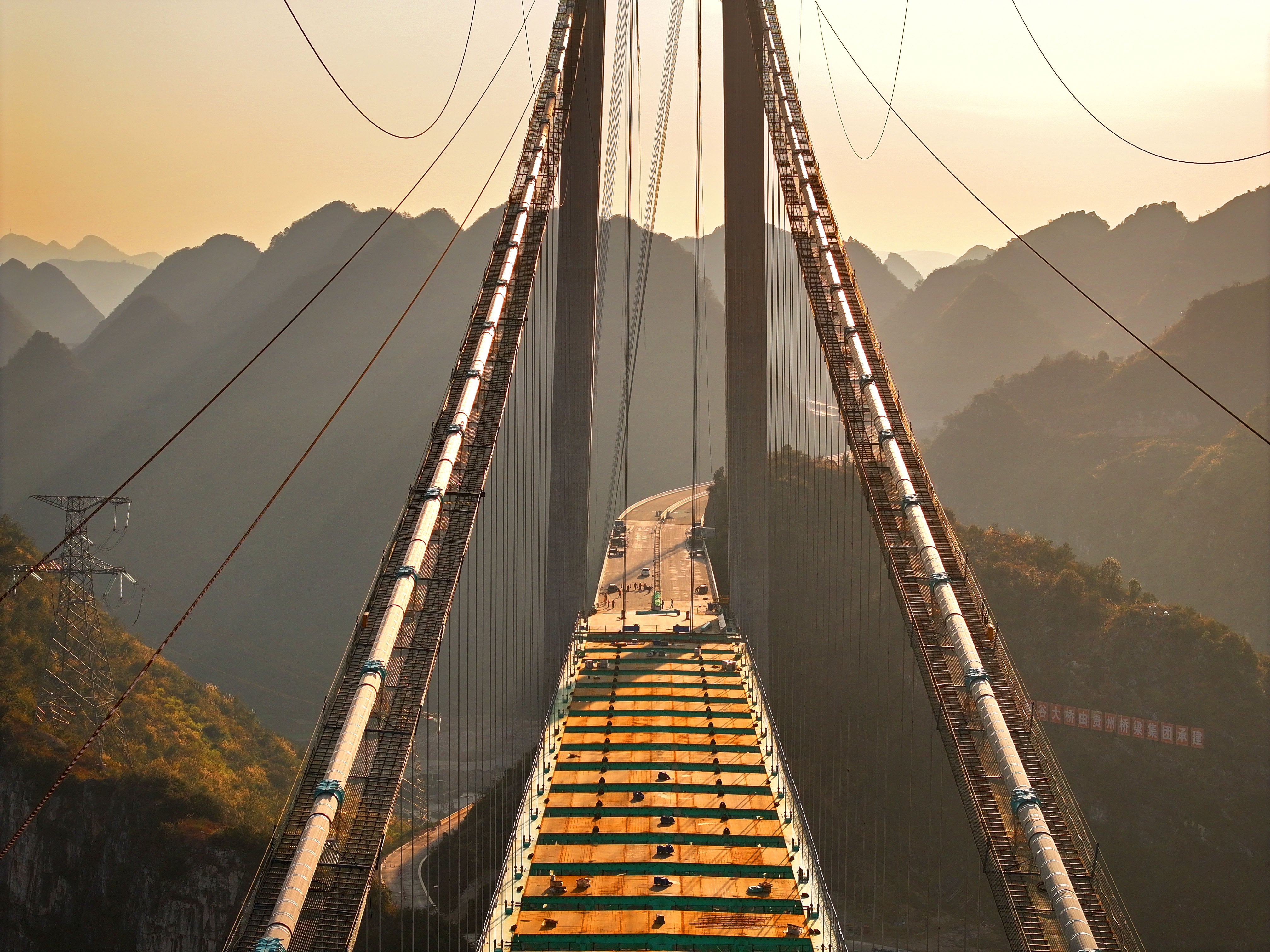 Los datos son impresionantes. La distancia entre los dos pilares del puente es de 1.420 metros, tiene una longitud de 2.890 metros y está suspendido a una altura de 625 metros, teniendo por debajo el río Beipan. Cerca de allí se encuentra otro puente, el Beipanjiang, que era el más alto del mundo con sus 565 metros, pero será destronado por esta nueva infraestructura que se convertirá en un tramo clave de la autopista Liuzhi-Anlong, consiguiendo un ahorro del tiempo de recorrido por el cañón de aproximadamente una hora a dos minutos.