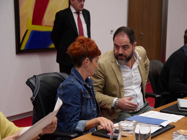 La portavoz de EH Bildu, Bakartxo Ruiz (i), y el portavoz del PSN, Ramón Alzorriz (d), durante la reunión de la Mesa y Junta de Portavoces del Parlamento de Navarra celebrada este lunes / Iñaki Porto (EFE)