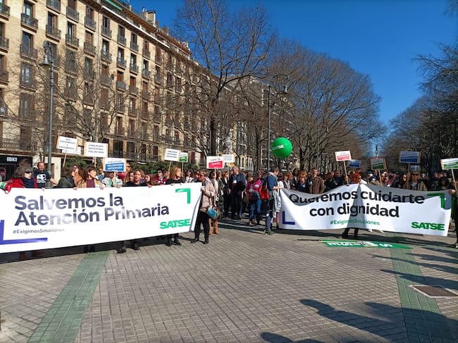 Así lo ha anunciado la secretaria autonómica del sindicato, Mª José Algarra, al final de una manifestación que ha recorrido este sábado las calles de Pamplona. La movilización ha partido a las 12.00 horas desde el centro de salud del barrio de San Jorge precedida por una pancarta con el lema 'Queremos cuidarte con dignidad'. También se ha podido ver otra pancarta con el mensaje 'Salvemos la Atención Primaria'. Los manifestantes portaban globos verdes así como carteles con reivindicaciones como 'Más enfermeras y enfermeros', 'Sustituciones 100%', 'Más plazas de especialista' o 'Jubilación anticipada voluntaria'.