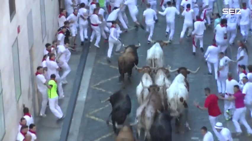 La misma tónica se ha repetido a lo largo de toda la calle Estafeta donde se han vivido los mayores momentos de tensión, con dos corredores que, a escasos metros de distancia, han sido volteados por un toro castaño, y varios más a los que la manada les ha pasado por encima sin prestarles especial atención.