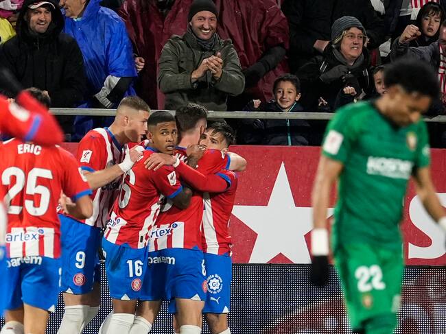 Los jugadores del Girona celebran el gol de Portu durante un partido de la jornada 28 de LaLiga EA Sports entre el Girona y el Osasuna este sábado en el estadio de Montilivi, en Girona / David Borrat (EFE)