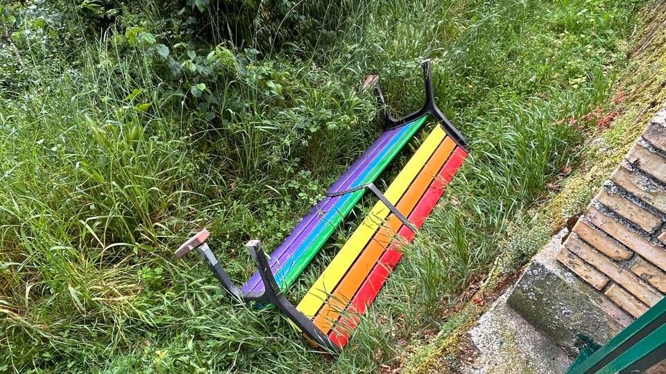 Acto de LGTBIfobia con el que ha amanecido Pamplona. El banco LGTBI del parque de la Media Luna ha sido arrancado y arrojado al cauce del río. No es la primera vez que ocurre un acto de este tipo en la capital navarra. Ya a lo largo del año 2023 fue arrancado y desplazado de su ubicación varias veces un banco también pintado con los colores del arcoíris, ubicado en este caso en Sarriguren.