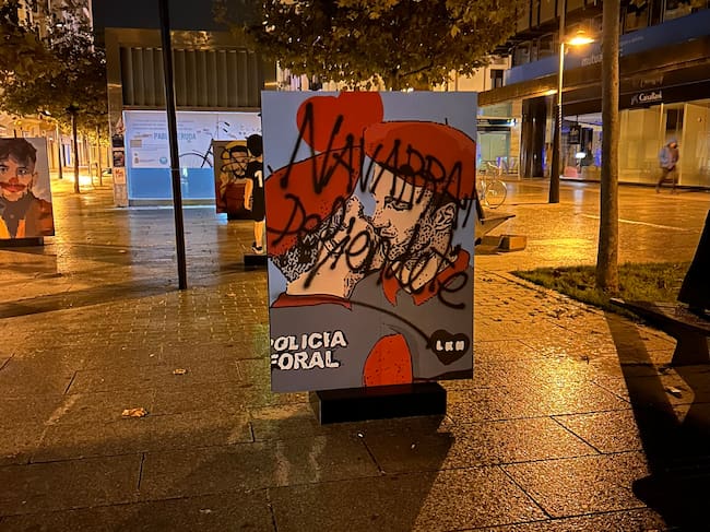 "Navarra defiéndete". Es la única frase pero también la reivindicación de la autoría del ataque que ha sufrido la madrugada de este miércoles la exposición del artista gráfico LKN colocada el pasado lunes, hace sólo dos días. La muestra está colocada en la avenida de Carlos III en el tramo entre los cruces con Avenida Roncesvalles y calle Arrieta y se titula "Reza por mí/Otoi nire alde". Llegando desde la Plaza del Castillo lo primero que llama la atención es el rectángulo negro que tapa el desnudo de la obra que mezcla una estatua clásica con la cara de la actriz Clara Galle. El vandalizado de "Clara y pura" es el más exhaustivo pero el ataque también ha tapado el rostro de la cantante Amaia Montero en otra obra que pone su rostro en una imagen que puede recordar a una virgen barroca y que LKN titula "La reina del pop". La pintura negra también tapa los genitales de la escultura del David de Miguel Ángel al que LKN pone el rostro del osasunista Aimar Oroz. Han tachado también los rostros de los osasunistas Michael Robinson y Roberto Torres, que el artista presenta con nimbos tras sus cabezas al estilo de los iconos religiosos. La autoría ultra del ataque se reivindica en la obra que LKN colocó en su día frente al Parlamento de Navarra y que muestra un beso entre dos hombres policías forales; "Navarra defiéndete".