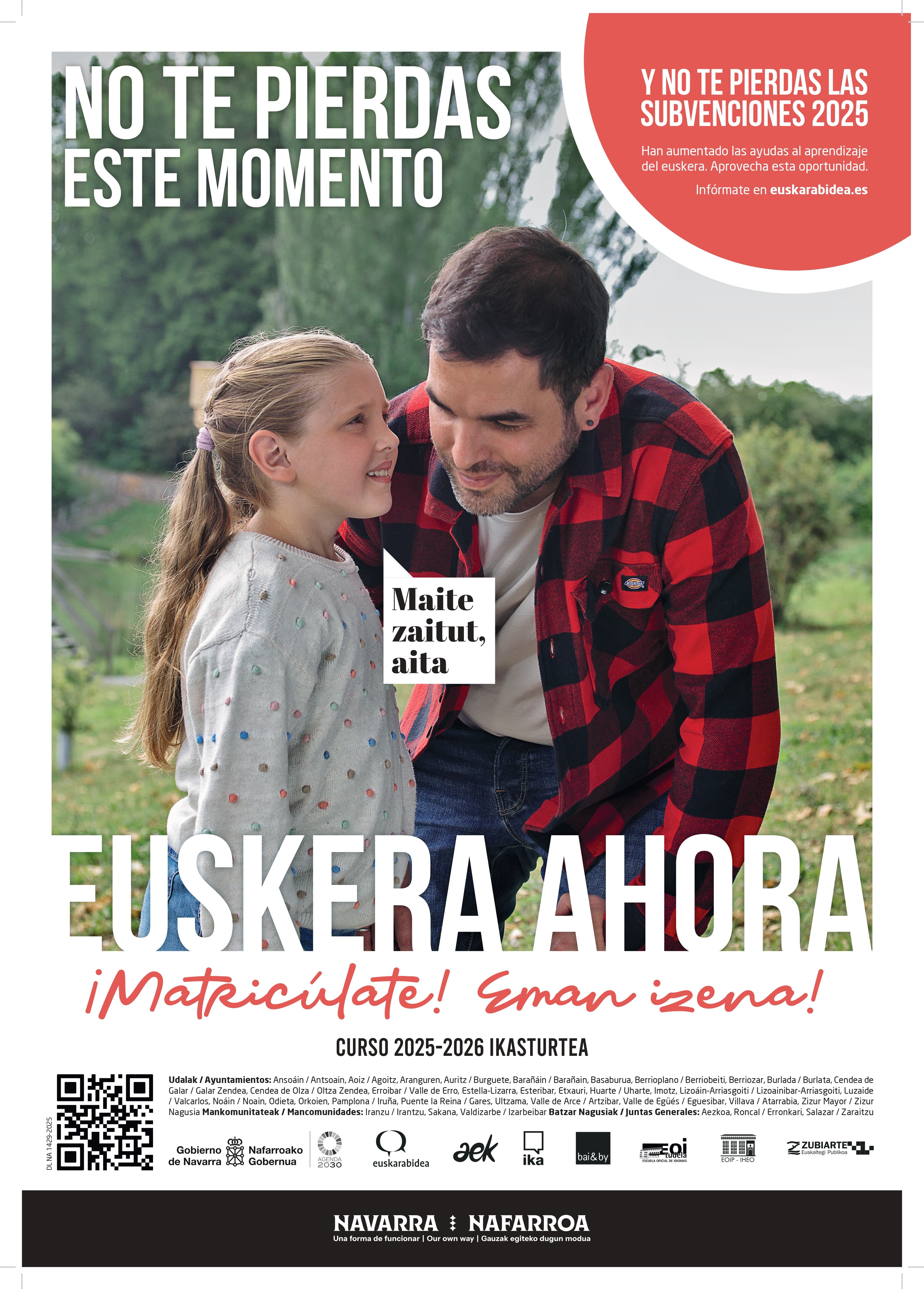 El Departamento de Memoria y Convivencia, Acción Exterior y Euskera del Gobierno de Navarra, a través de Euskarabidea - Instituto Navarro del Euskera, ha organizado la campaña anual "Euskera ahora" para impulsar el aprendizaje del euskera. Esta campaña se ha realizado en colaboración con 34 entidades locales y agentes del ámbito de la enseñanza del euskera a personas adultas: el euskaltegi público Zubiarte, las escuelas oficiales de idiomas y los euskaltegis de AEK, IKA y bai&by. Dando continuidad al lema del año pasado, "Euskera ahora", se pretende destacar las experiencias y oportunidades que ofrece aprender euskera.