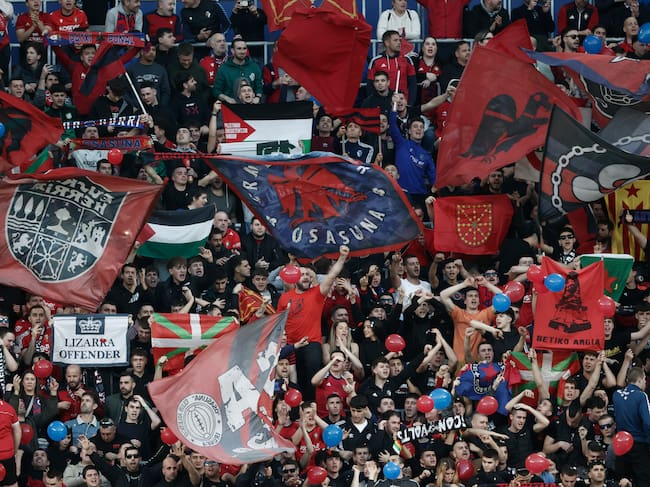 PAMPLONA, 21/02/2026.- Aficionados del Osasuna animan a su equipo durante el partido de la jornada 25 de LaLiga EA Sports que disputan el CA Osasuna y el Real Madrid este sábado, en el estadio El SADAR de Pamplona. EFE/ Jesús Diges / EFE/Jesus Diges (EFE)
