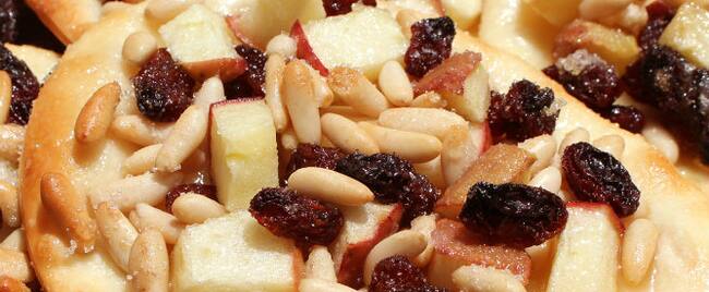 Preparación: precalentamos el horno a 200 grados. Sobre la bandeja del horno, que habremos previsoramente extraído, colocamos nuestro hojaldre desenrollado y sobre el papel resistente al calor que trae. Pinchamos un poco la masa, le ponemos por encima unas gotas de aceite de oliva y lo extendemos bien por toda la superficie. Luego esparcimos por encima un buen puñado de piñones, hacemos lo mismo con las pasas y le ponemos manzana cortada en cuadraditos. Rematamos espolvoreando con abundante azúcar y lo metemos en el horno. ¿Y el anís? Os preguntaréis. Pues bien, cuando el hojaldre esté doradito lo sacamos del horno y todavía muy caliente, lo rociamos con anís que habremos metido en un pulverizador. Esto hace que el azúcar cristalice y quede maravillosamente crujiente. Una delicia.