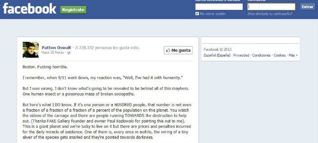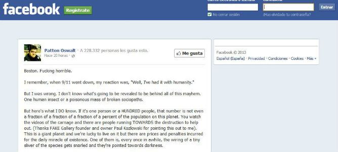Patton Oswalt es un actor y cómico estadounidense que aquí no conocemos demasiado, pero que ha protagonizado el viral del día. Nada más conocerse el ataque del maratón de Boston, escribió cuatro párrafos en su muro. Normalmente es muy ácido, pero en esta ocasión escribió algo totalmente inesperado, un mensaje de buen rollo cuando todo el mundo estaba preguntándose por el causante de esta masacre.