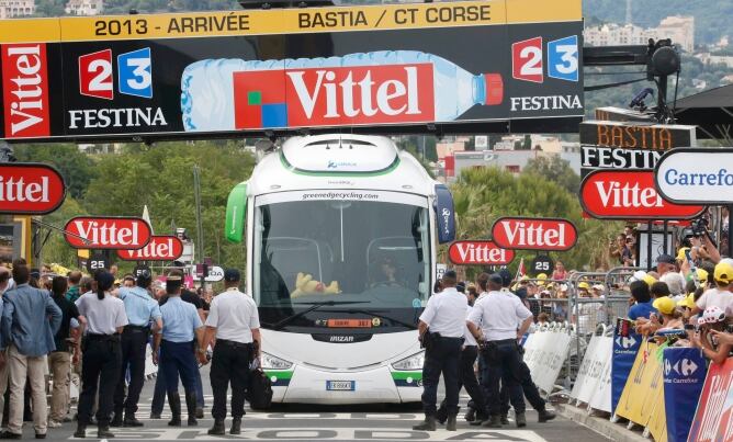 Caída de Contador aparte (dice que sólo ha sido "chapa y pintura"), un autobús sembró el pánico en la línea de meta de Bastia, el final de la primera etapa. Mientras los periodistas, los inalámbricos, íbamos tomando posiciones para la llegada de los corredores, para esa primera declaración cuando aún llegan asfixiados, escuchamos gritos y veíamos carreras hacia la meta. Markínez, Anselmo Fuerte y Ángel Cabrera, nuestro técnico, me lo explicaron después. Desde la cabina de transmisiones escucharon un golpe fortísimo, casi un bombazo.