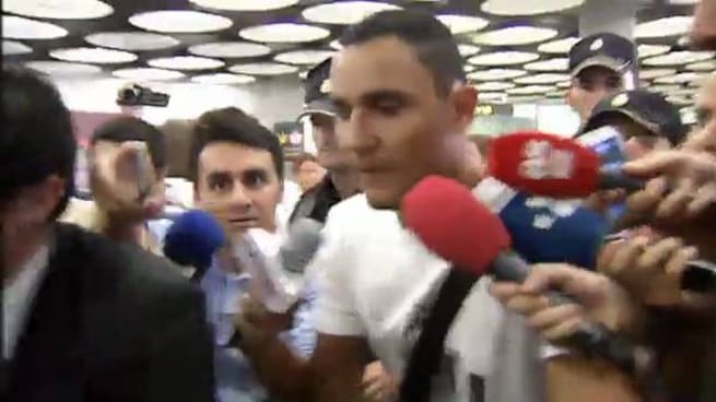 El guardameta costarricense, Keylor Navas se encuentra ya en Madrid donde será presentado como nuevo jugador blanco, tras llegar al aeropuerto de Barajas en medio de una gran expectación mediática y ante un gran número de aficionados, muchos de ellos compatriotas suyos. En las escasas declaraciones que ha realizado a los periodistas allí presentes, Navas se ha mostrado "muy contento e ilusionado" con esta nueva etapa de su carrera. / ATLAS
