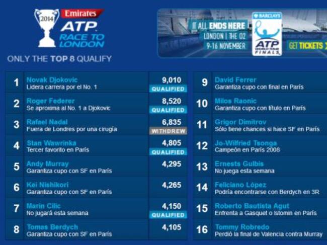 Vuelve Ferru a París, su ciudad, donde ha cuajado sus mejores hitos en el mundo del tenis. La final de Roland Garros y el título en Berçy refrendan ese algo especial que tiene el de Jávea con la capital francesa. Ferrer necesita hacer como mínimo lo mismo que Raonic para clasificarse, y mirar de reojo a Dimitrov. Por delante tiene a Berdych, Murray y Kei Nishikori, a lo que podría adelantar con un gran actuación.