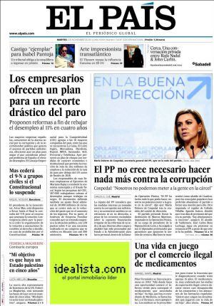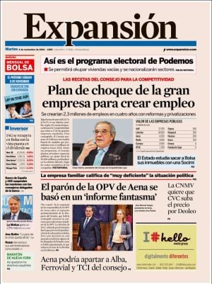"Plan de choque de la gran empresa para crear empleo" resume Expansión en primera las recetas del Consejo de la Competitividad para bajar el desempleo al 11% en 2018. "La gran empresa exige erradicar el fraude fiscal", sintetiza por su parte El Periódico que sigue recordando en primera pàgina que "el drama de los desahucios sigue muy vivo. Barcelona registra una media de 15 alzamientos al día". El problema, como apunta El Mundo en un editorial, es que el clima político se convierta en el primer obstáculo para el crecimiento y la corrupción o el órdago secesionista de la Generalitat son los principales asuntos de los que hablan las agencias de notación. Para el economista Santiago Carbó, en su tribuna del diario global, una opción en la lucha contra la corrupción mediante el voto sería apoyar una alternativa emergente, la que concentra el desencanto. Es decir, Podemos, sobre la que los grandes empresarios no se quisieron pronunciarse pero que, según Cinco Días, es "un dólor de cabeza creciente para los inversores". Es más, Expansión avanza el programa electoral de Podemos y destaca dos medidas: "se permitirá okupar viviendas sociales y se nacionalizarán sectores".