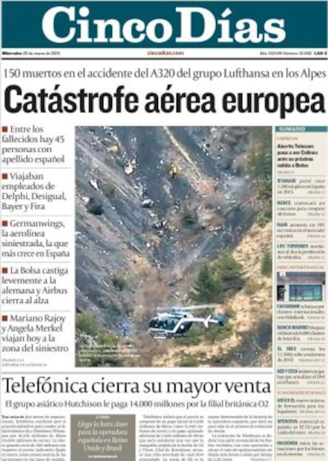 "Catástrofe aérea europea". El titular de Cinco Días da cuenta de la dimensión de lo sucedido ayer en Los Alpes.