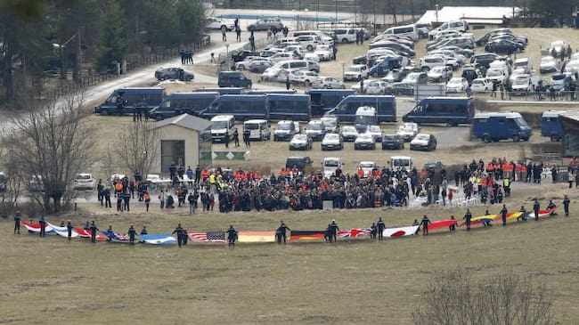 GUI05 LE VERNET (FRANCIA), 26/03/2015.- Familiares de las víctimas del vuelo Barcelona-Düsseldorf que se estrelló en los Alpes el pasado martes, durante el homenaje que se ha organizado hoy, jueves 26 de marzo de 2015, en memoria de los fallecidos en un c / GUILLAUME HORCAJUELO (EFE)