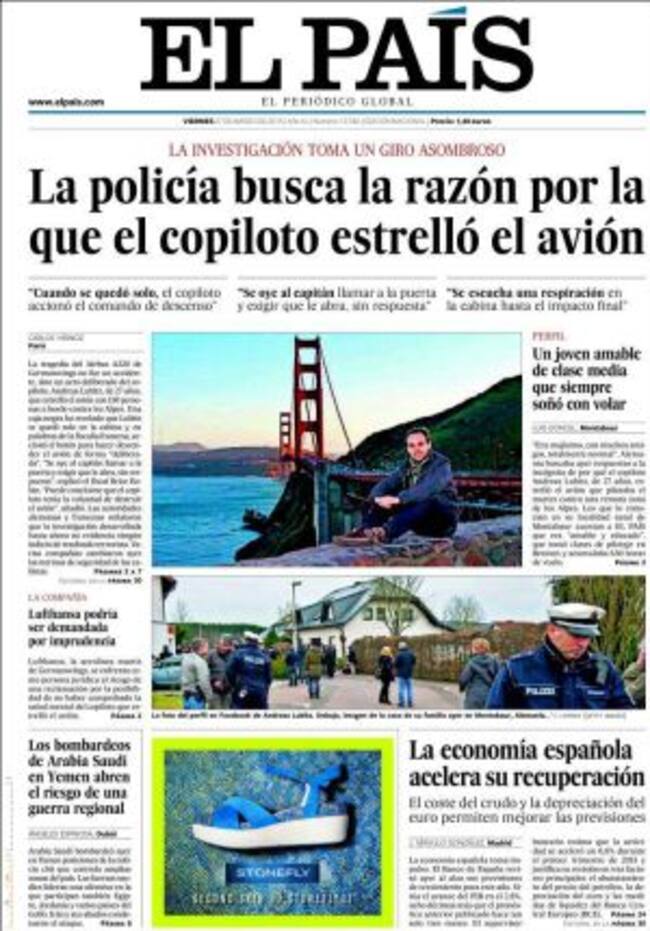 "¿Qué tiene que pasar en la mente de un hombre en cuyas manos están las vidas de 149 personas para que las arrastre en su suicidio? El misterio de la catástrofe de los Alpes de Provenza ya está técnicamente resuelto. No fue un accidente, sino un crimen". De esta manera arranca Rafael Poch, el corresponsal de La Vanguardia en París, la crónica de lo que define como "un crimen inimaginable". Andreas Lubitz "era majísimo, con muchos amigos, totalmente normal", le cuenta un conocido del copiloto a Luis Doncel, el corresponsal de El País en Berlín. "Un joven amable de cla se media que siempre soñó con volar". Un sueño que se pudo convertir en "una obsesión por ser el mejor", advierte ABC. La prensa alemana, de hecho, le pinta como "un joven al que le gustaban las páginas web de bromas, algunas incluso pesadas o muy irónicas políticamente; también la comida rápida, era un aficionado a correr y daba alguna que otra fiesta con el volumen a tope en su casa de Düsseldorf", leemos en Die Welt. Todo normal en un joven de 27 años.