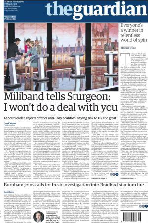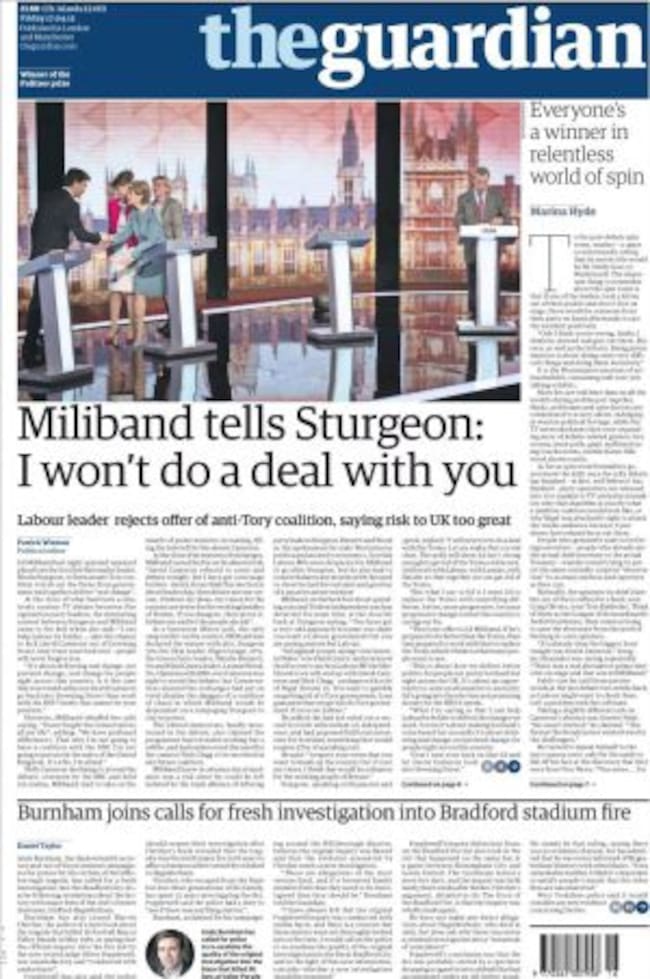 Y si antes decíamos que Ribera es objeto de análisis en Wall Street, el diario Le Monde nos explica que la City londinense ha declarado la guerra a Ed Miliband, el líder laborista. Atrás queda la reconciliación con Tony Blair y los laborista se financian casi exclusivamente a través de los sindicatos. Así que el mundo financiero apoya masivamente a los tories que, por su parte, apuntan a un Miliband atrapado por los nacionalistas escoceses. Una campaña le situaba como pañuelo de bolsillo en las chaquetas de Alex Salmond y de Nicola Sturgeon. Anoche, de hecho, el primer debate entre Miliban y el resto de líderes de la oposición se saldó, según leemos en el Guardian, con un rifi-rafe con la líder del Partido Nacional Escocés que, como señala El País en primera, "será decisivo en las legislativas del reino Unido".