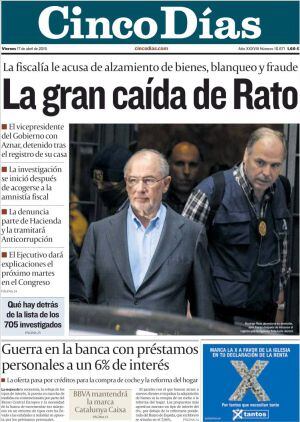 Es "La gran caída de Rato", sintetiza Cinco Días. Un hombre político que "ha perdido la mesura en estos últimos años" aseguran quienes le conocen a Íñigo de Barrón en El País. "Parecía que había dejado de tener contacto con la realidad y era una persona poco centrada", explica un directivo bancario que ha tenido trato frecuente con el que fuera vicepresidente del Gobierno y al que parece atrapar el estigma de su padre que cumplió condena de tres años en la cárcel de Carabanchel por blanqueo de capitales, nos recuerda Miguel Ángel Noceda, que cita la frase de Baltasar Gracian: "Haz fama y fortuna: las dos en una. Lo que tiene la una de inconstante, tiene la otra de firme". Es "el ocaso del patriarca" para el director de La Vanguardia Marius Càrol. Es "el fin de una época" para El Mundo que señala a Rato como el único responsable de lo que le sucede y exime, como ABC, de toda responsabilidad al PP y al Gobierno. Sin embargo, como señala El País, "en términos políticos, las consecuencias para el PP pueden ser de una extrema gravedad" porque "no se puede argüir que ya no representa un poder en el partido, porque forma parte de una gestión de gobierno mitificada en exceso desde Génova".