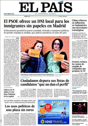 "El PSOE ofrece un DNI local para los inmigrantes sin papeles en Madrid. El documento permitirá acceso a sanidad, vivienda y transporte públicos". Se trata de una medida de su candidato al Ayuntamiento de Madrid, Antonio Miguel Carmona, que el partido podría extender al resto del país. "El duodécimo día de campaña ha aparecido, por fin, una propuesta novedosa y digna de debate para las municipales", se congratula Javier Ayuso en su columna. Mientras que Antoni Puigverd en la suya de La Vanguardia analiza a Carmona, quien, a su juicio, "si nadie te dice que es del PSOE, podrías pensar que es del PP, incluso por las corbatas que elige".