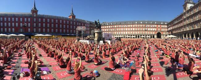 La Plaza Mayor de Madrid se ha teñido de granate. En este caso no era una nueva marea, eran más de 3.000 personas participando en una clase magistral de yoga. En la plaza no cabía ni una esterilla más, algunos se tuvieron que quedar fuera. Otros, para asegurarse su lugar en las primeras filas, han hecho cola desde las ocho de la mañana, tres horas antes de que empezara la clase.