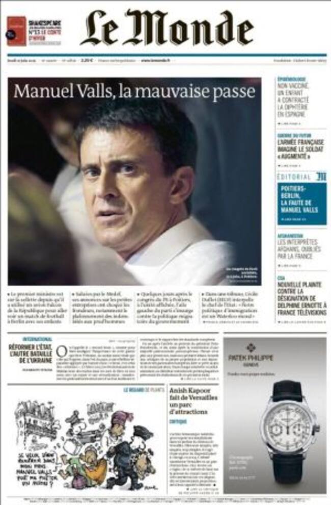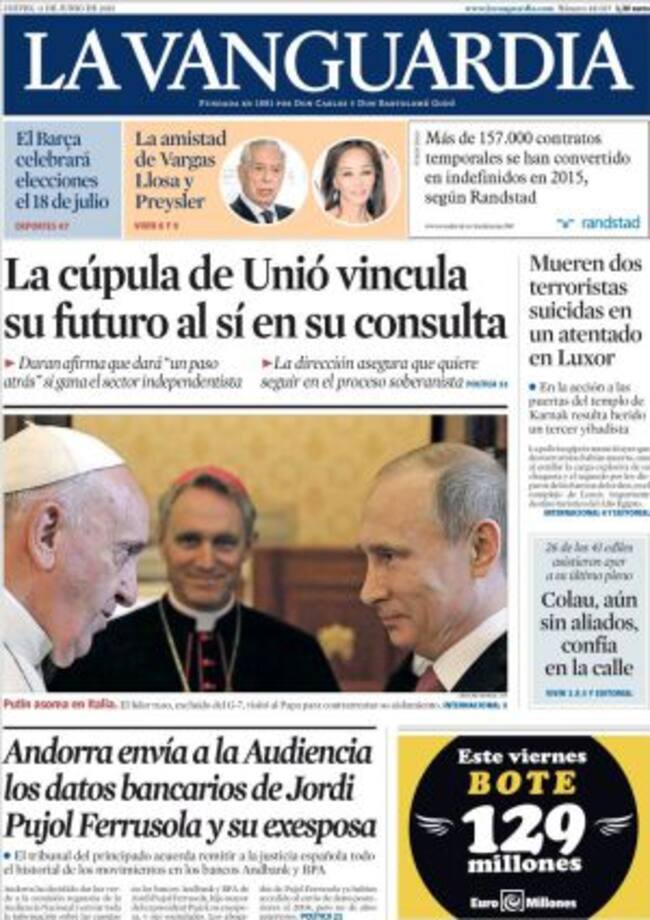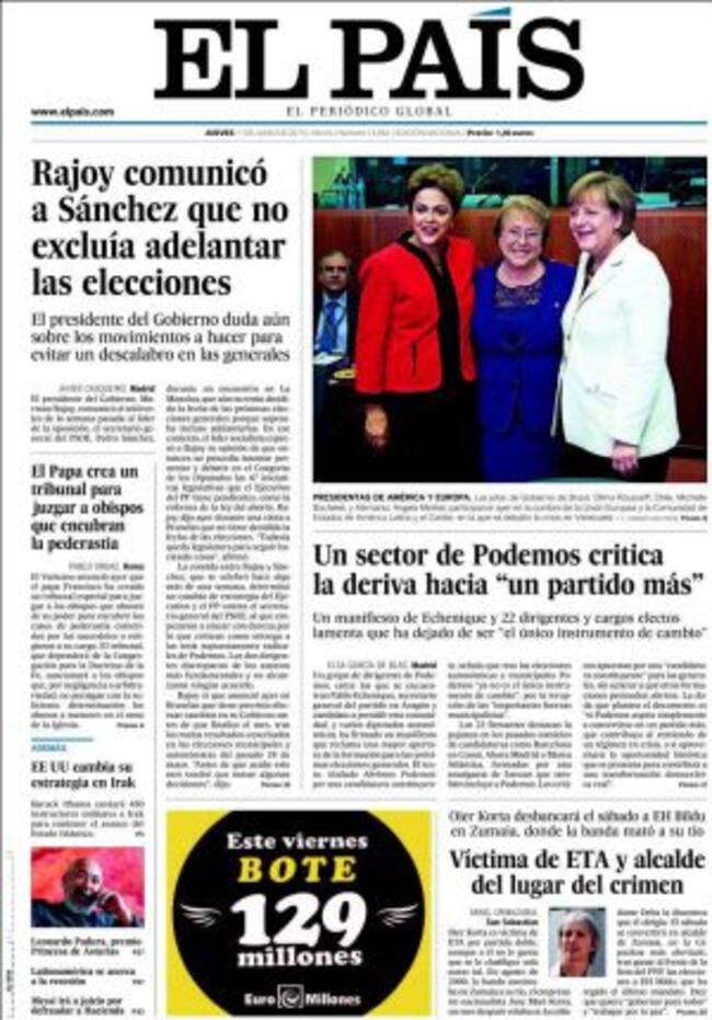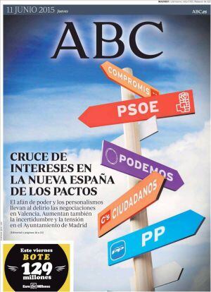 "Caos político en Valencia", advierte en un editorial ABC que en primera denuncia el "cruce de intereses en la nueva España de los pactos" con la foto de un poste de direcciones en el que PP y Ciudadanos apunta a la derecha; PSOE y Compromis a la izquierda y el único que apunta hacia atrás es Podemos. El partido de Pablo Iglesias, como les venimos contando en la SER y también recoge en primera El País, se ve agitado por un sector encabezado por el otro Pablo, Echenique, que "critica la deriva hacia "un partido más" y propone integrarse en listas de unidad de cara a las generales porque Podemos ha dejado de ser "el único instrumento de cambio".