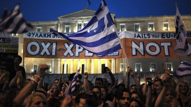 ATE04. ATENAS (GRECIA), 29/06/2015.- Manifestantes por el NO son vistos hoy, lunes 29 de junio de 2015, en la plaza Syntagma frente al edificio del parlamento griego en Atenas (Grecia). Votantes griegos decidirán en un referéndum el próximo domingo si su / FOTIS PLEGAS G. (EFE)