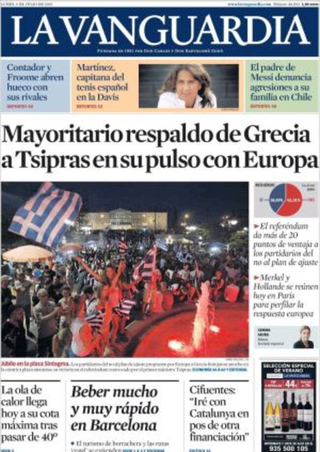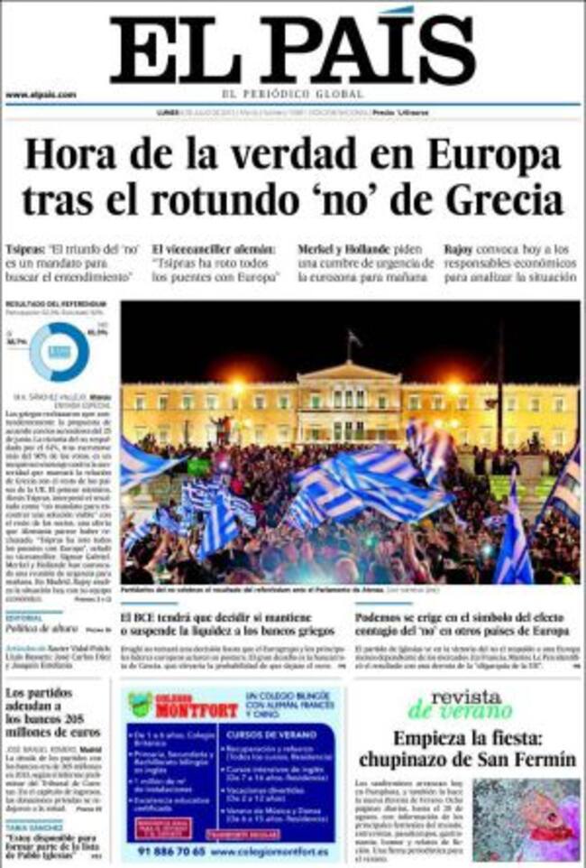 "Europa se encuentra ante una hora decisiva que puede marcar varias décadas. Todos los pasos a dar son arriegados y comprometidos. Pero es importante no dejar que el porvenir sea decidido por un grupo de demagogos en Atenas y otros muchos, a izquierda y a derecha, que querrían sumárseles en los próximos días en varios países del continente. Se precisa una respuesta hábil y firme al mismo tiempo". Esta es la petición que formula El País en su editorial en un momento trascendental en el que, a la luz de los diarios conservadores europeos, se observa como el continente se fragmenta: "Una feroz disputa sobre el Grexit amenaza la Unión Europea", advierte en su titular el Die Welt. Al otro lado del Rin, Le Figaro constata también que "Grecia da un gran paso hacia la salida del euro" mientras que el Times de Londres, en un editorial que titula "piedad y miedo" advierte que "los europeos ven con simpatía a los griegos que sufren, pero han causado un daño terrible al euro". Ni tan siquiera los diarios más a la izquierda cierran filas en torno a Tsipras. Liberation, por ejemplo, considera que el "no" supone oxígeno para Syriza pero en su editorial constata que el resultado firma "el divorcio" entre Grecia y sus socios.