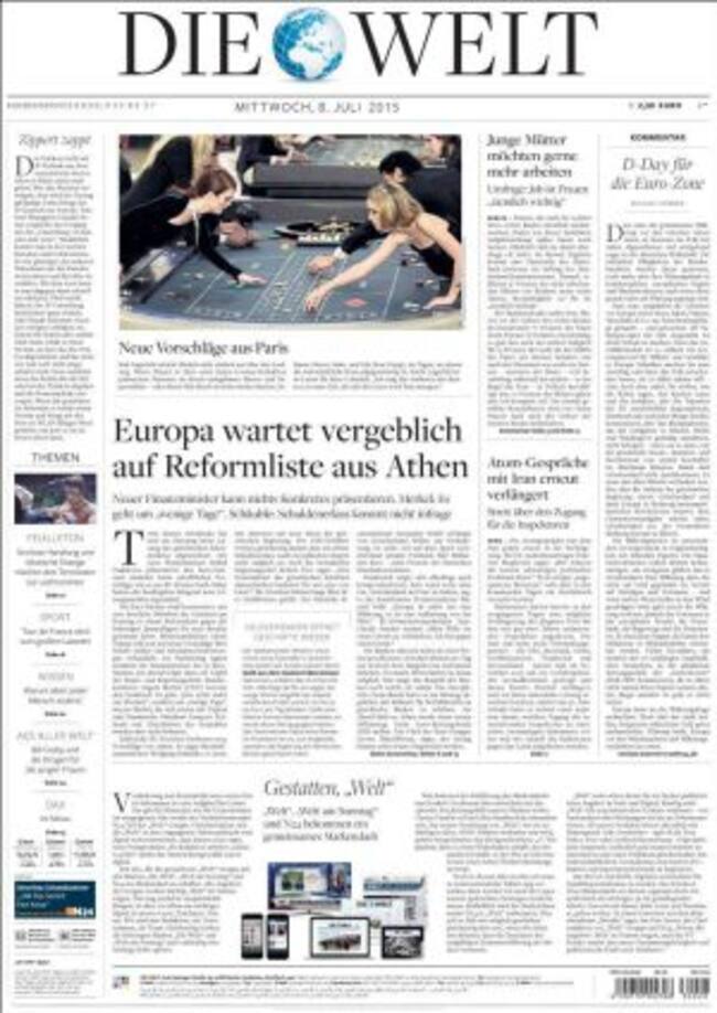 Aunque nos sea español, Alexis Tsipras aparece feliz y contento cuando llega a Bruselas. El primer ministro griego siempre sale sonriente en todas las fotos mientras sus interlocutores, Merkel, Hollande y Juncker muestran talantes más bien serios. La situación no es para menos si echamos un vistazo al Die Welt que establece una "fractura griega". De un lado, Francia, la Comisión Europea y Estados Unidos. Del otro, Alemania y la mayoría de miembros del Eurogrupo, incluido España. La decepción de que Grecia llegara ayer sin una propuesta la sintetiza Marius Càrol en La Vanguardia con una frase: "la sensación de hartazgo se está apoderando de la Unión Europea y del BCE... cada día son más los mandatarios que creen que hay que colgar el cartel de "esto es todo amigos". De hecho, en El Mundo, Jean Claude Juncker advierte que "hay un plan detallado para que Grecia salga del euro". El Grexit gana terreno a pesar de que Martin Wolf en el Financial Times vuelva a advertir que "fragiliza el euro" y que el Süddeutsche analice los compromisos financieros de Grecia y concluya que este sería el peor año porque el resto puede ser asumido si se escalona el pago de la deuda hasta 2054. Cinco Días, de hecho, habla de "un acuerdo a largo plazo para evitar la bancarrota" y anuncia optimista que "llega el tercer rescate" a pesar de que la nueva oferta de Tsipras es calcada a la anterior al referéndum.