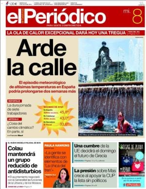 Hace calor y los españoles somos gente feliz. "Arde la calle", titula El Periódico parafraseando la canción de Radio Futura con la foto de dos chavales bañándose sin vergüenza en la fuente de la plaza de Catalunya en Barcelona. La máxima de España ayer la registró Xátiva, en Valencia, con casi 46 grados pero, advierte, "el episodio meteorológico de altísimas temperaturas en España podría prolongarse dos semanas más". Si el exceso de calor se considera mal tiempo se podría explicar el ánimo de los españoles: "uno de cada 10 es completamente feliz", concluye El País en primera a la luz de los datos ofrecidos por el CIS que además da a entender que la felicidad va en aumento porque el porcentaje de españoles que sitúa su grado de felicidad entre el 6 y el 10 ha subido ligeramente desde el pasado mes de enero. No obstante, las estadísticas no nos explican las causas de esa felicidad aunque sí los motivos de preocupación: el paro, la corrupción y los políticos.