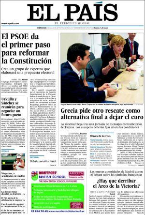 "El PSOE da el primer paso para reformar la Constitución", asegura El País que en un editorial da la bienvenida a la iniciativa de Pedro Sánchez y de Ciudadanos porque "el inmovilismo es la peor opción en tiempos de cambios". Y estos deberían hacer en la ley fundamental en aspectos como el mecanismo electoral, la distribución territorial y el funcionamiento de las Cámaras. Por cierto que El Mundo dedica su apertura a "los colocados del Senado": nueve expresidente autonómicos del PP y del PSOE. Entre tanto, la presión aumenta sobre Mas, señala El Periódico, por el apoyo de la CUP a una lista sin políticos en Cataluña. Esta opción, analiza Isabel García Pagán en La Vanguardia, convertiría el 27S en un plebiscito y obligaría a Mas, aún en funciones, en convocar una nueva cita electoral en febrero.