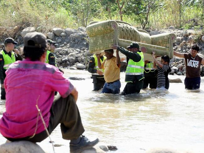 BOG07. CÚCUTA (COLOMBIA), 28/08/2015.- Un grupo de colombianos, con ayuda de miembros de la Policía Nacional, pasa sus pertenencias por el río Táchira desde Venezuela hoy, viernes 28 de agosto de 2015, hacia el lado de Colombia en la frontera. El miedo a / Mauricio Dueñas Castañeda (EFE)