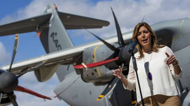 GRA169. SEVILLA, 14/09/2015.- La presidenta de la Junta de Andalucía, Susana Díaz, durante su visita hoy a la planta de San Pablo de Airbus Defence and Space, donde se realiza el ensamblaje del avión militar A400M, en el que ha sido el primer acto en su a / RAUL CARO CADENAS (EFE)