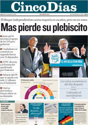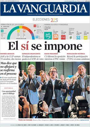 "El sí se impone". La Vanguardia juega con la victoria de la lista Junts pel Sí para evitar el no que se impone en el resto de diarios, en especial los de mayor vocación centralista. "Cataluña no se quiere ir" es la conclusión de ABC mientras que El País opta por otra más equilibrada: "los independentistas ganan las elecciones y pierden su plebiscito". Es la "derrota y victoria" que le sirve para titular un editorial en el que considera que "los secesionistas han perdido claramente el plebiscito que ellos mismos desearon". Pero una cosa son los titulares y otra los análisis y en la propia Vanguardia, Antoni Puigverd escribe: "Se decía en Madrid que el catalanismo era un tigre de papel que ruge pero no muerde. Ahora sabemos que muerde, pero menos de lo que el tigre creía. Le falta colmillos". Joaquín Luna, en su columna, estima que es "una victoria poco exportable". "Cómo va el mundo a reconocer una secesión sin mayoría de votos y con las CUP, un socio bolivariano?"
