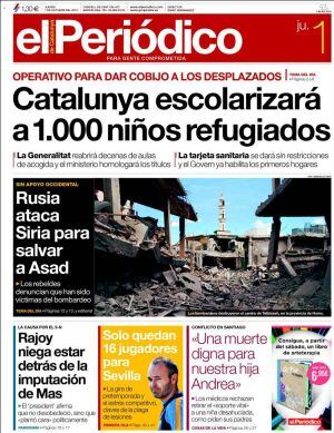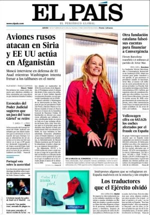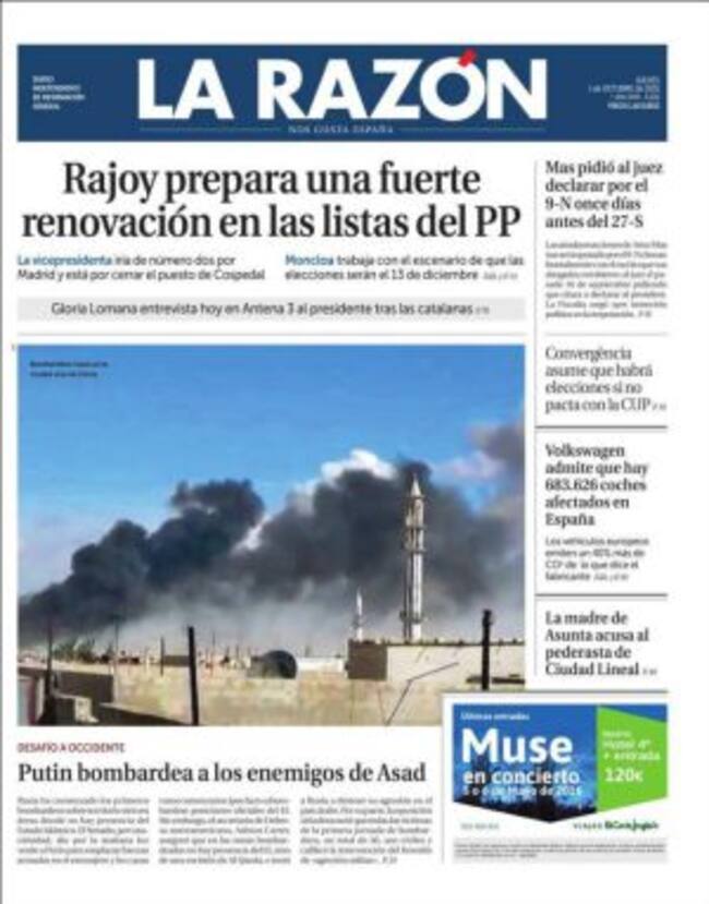 "Aviones rusos atacan Siria y Estados Unidos actúa en Afganistán. Moscú interviene en defensa de El Asad mientras Washington intenta frenar a los talibanes en el norte", explica de manera didáctica en su apertura El País. Lluis Bassets explica en un análisis que "el objetivo es terminar con la guerra. Pero la guerra también es una oportunidad para que cada uno avance sus peones. Rusia, Turquía, Irán o Francia utilizan a Siria para sus respectivos intereses particulares". De momento, no obstante, los comentarios de la prensa occidental van contra el presidente ruso a quien Gideon Rachman en Financial Times no duda en comparar con George Bush Jr. en su lucha contra el terror en Irak. "No ha finalizado un conflicto -en referencia a Ucrania- y ya comienza otro" para ganar legitimidad en su lucha contra el terror.