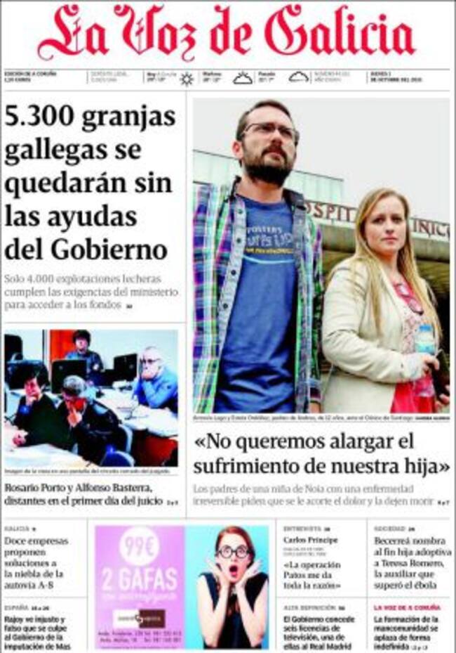 "Dejen que nuestra hija cierre los ojos y se valla tranquila". Es la petición de los padres de Andrea que ayer les avanzábamos en estos micrófonos y que esta mañana reclama la atención de los lectores con titulares en las primeras páginas: "no queremos alargar el sufrimiento de nuestra hija", resume La Voz; "una muerte digna para nuestra hija Andrea", clama El Periódico. Es un caso sobre el que El Correo reflexiona en un editorial al señalar que "ningún médico o autoridad sanitaria puede hacer prevalecer su conciencia sobre la prolongación esteril del dolor de un paciente" y pide que las Cortes apruebe una regulación precisa que "impida el recurso directo o encubierto a la objeción de conciencia de los facultativos... y evite en lo posible el requerimiento judicial con la consiguiente exposición pública de una peripecia tan íntima y dramática". Como de hecho sucede con el juicio retransmitido de la muerte de Asumpta: "sonrisas y llanto, dos caras de un juicio", resume La Vanguardia al hacer referencia a la actitud de la madre y a la postura desafiante del padre.