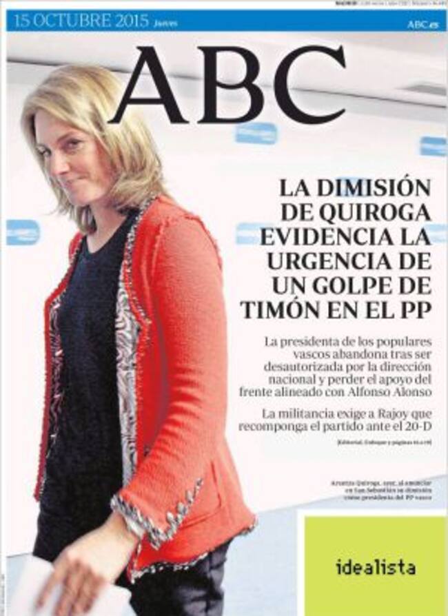 La pesadumbre de Aranza Quiroga por tener que dejar la presidencia del PP en el País Vasco ilustra las primeras de la prensa nacional esta mañana que consideran este paso como un síntoma de la crisis interna que vive el partido en el gobierno de cara a las elecciones generales...