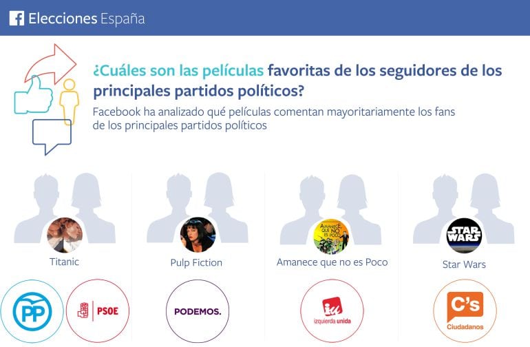 La red social Facebook ha analizado los datos de los seguidores de los cinco grandes partidos políticos y ha hecho un ránking sobre sus gustos divididos en cine, televisión, deporte y música.